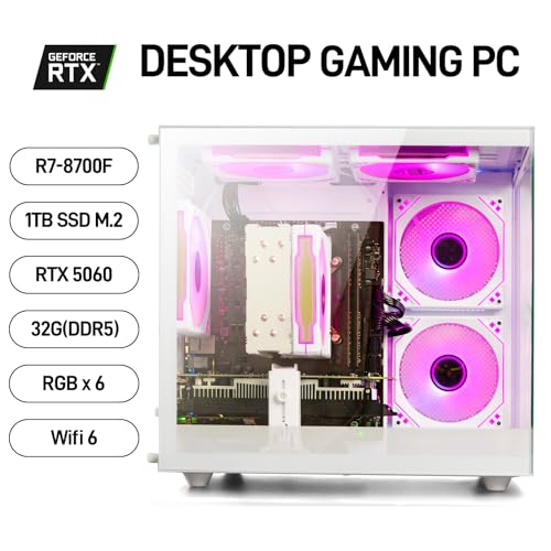 WIWB Gaming PC Desktop, Ryzen 7 8700F, GeForce RTX 5060(8G), 32GB DDR5 RAM, 1TB NVMe 3.0 SSD, Wi-Fi 6 650W PSU High-end Tower Computer (White)